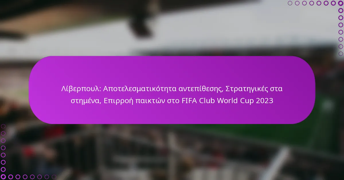 Η απόδοση της Λίβερπουλ στο FIFA Club World Cup 2023 αναδεικνύει τις αποτελεσματικές στρατηγικές αντεπίθεσης, οι οποίες εστιάζουν σε γρήγορες μεταβάσεις και εκμετάλλευση αδυναμιών στην άμυνα. Επιπλέον, οι καινοτόμες τακτικές στις στημένες φάσεις τους έχουν επιτρέψει να εκμεταλλευτούν τις ευκαιρίες για γκολ, επηρεάζοντας σημαντικά την συνολική τους επιτυχία στο τουρνουά. Κλειδί παίκτες έχουν επίσης παίξει καθοριστικό ρόλο, συμβάλλοντας σε γκολ, ασίστ και αμυντικές ενέργειες που διαμορφώνουν τα αποτελέσματα των αγώνων.